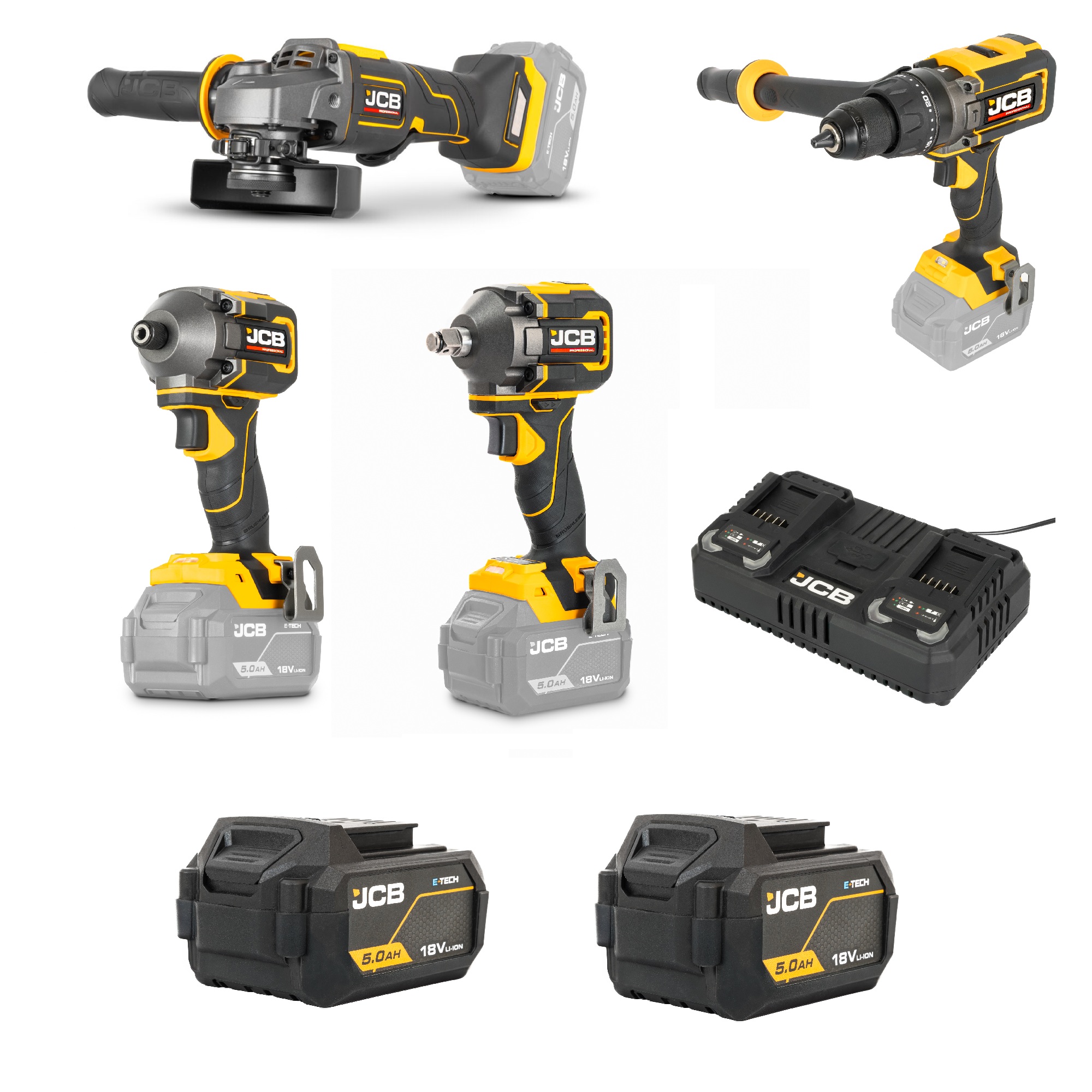 Complete JCB 18V gereedschapskit met combi boormachine, slagschroevendraaier, slagmoersleutel, haakse slijper en cirkelzaag. Inclusief 2x 5.0Ah accu en 4.5A dual snellader.