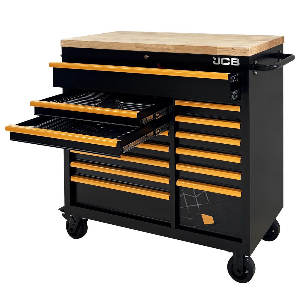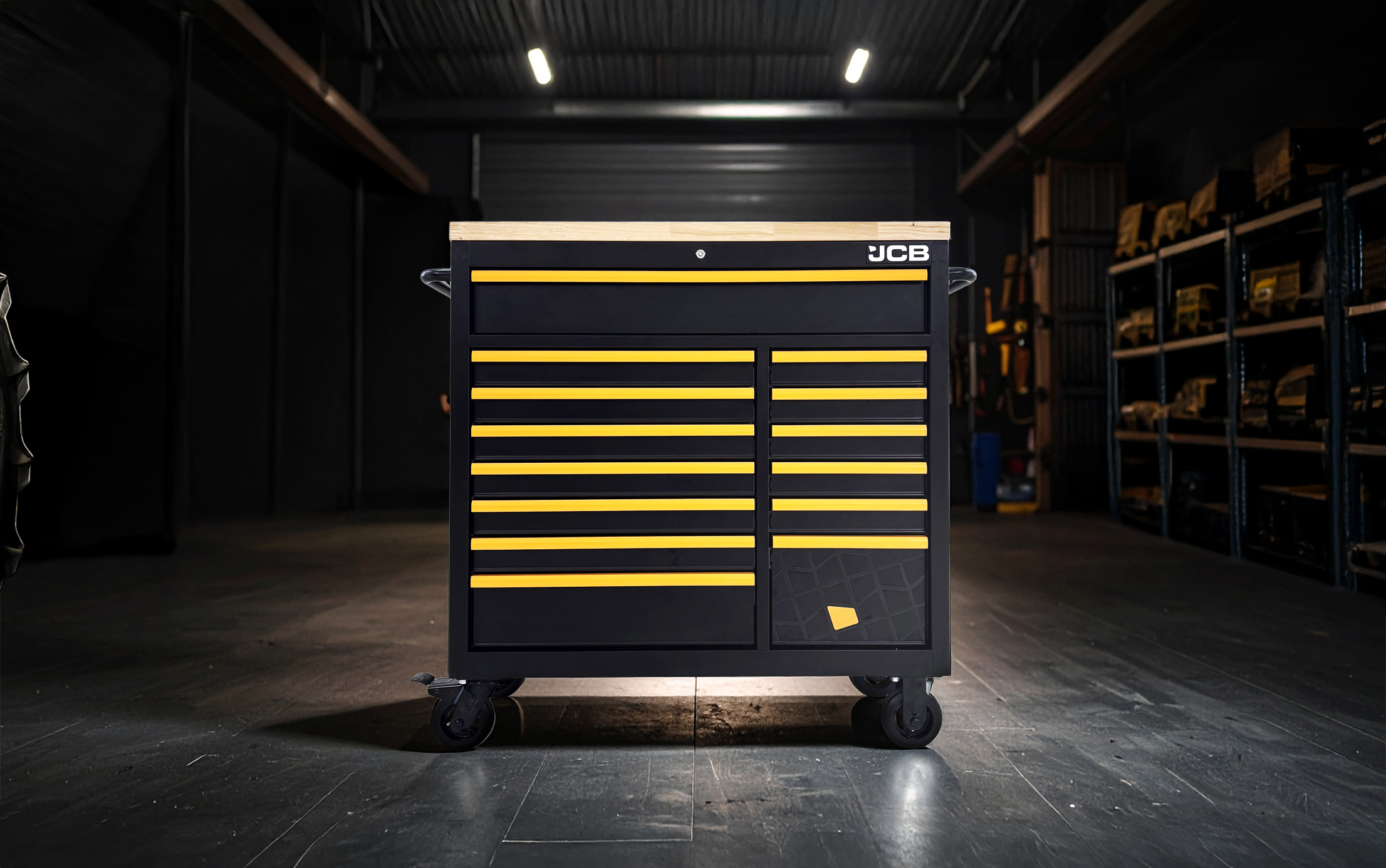 Professionele 42” JCB gereedschapskar met houten werkblad, 11 laden, vergrendeling en heavy-duty zwenkwielen. Duurzaam stalen ontwerp voor intensief dagelijks gebruik.