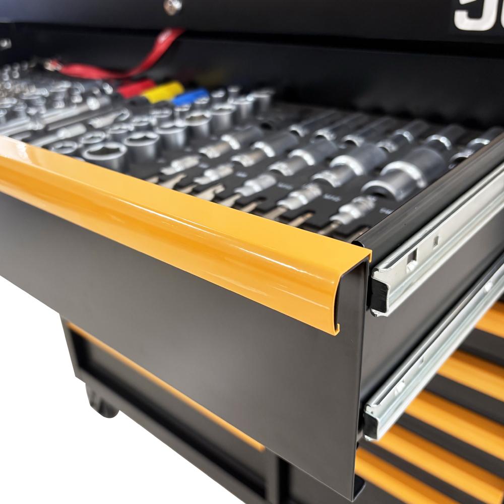 De JCB-42TCK-NL combineert een klassieke uitstraling met moderne duurzaamheid. De dubbelwandige stalen constructie en poedercoating beschermen tegen slijtage, krassen en corrosie. De 11 soepel lopende kogellagerladen bieden ruimte voor gereedschap van elke vorm en grootte, inclusief brede en diepe laden voor groot materieel.